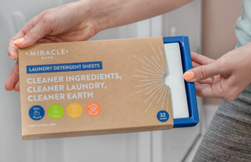 Liquid detergent is about 80% water. You pay to haul it home and store it under the sink. These sheets are different. One sheet per load. It dissolves in any temp. No mess. No measuring. A whole month fits in a box the size of a deck of cards. No plastic jug to recycle.